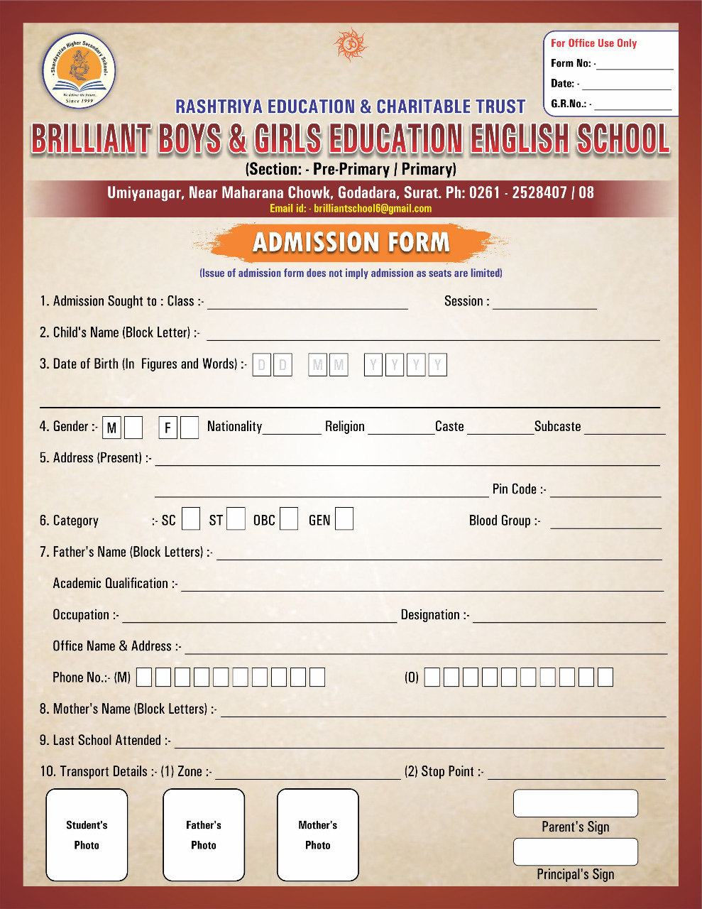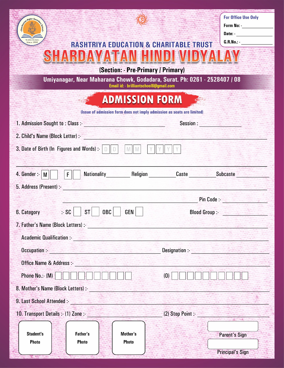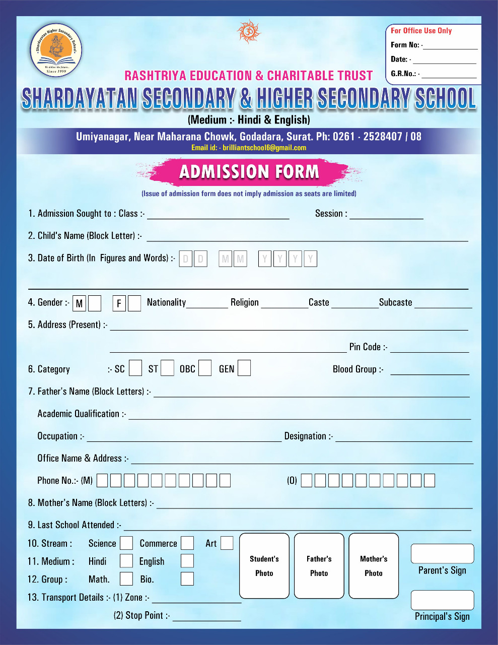 The new academic session of the school begins on April 1st week every year and it is desirable that all admission formalities be completed well in advance before the said date. We will be pleased to assist you for any queries you have about our school.